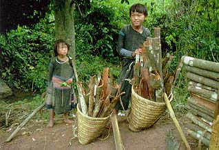 Hmong children return from a Cinnamon bark (Cinamomun cassia) collecting trip in an old growth forest. An adult can collect 30 to 40 kilograms in tree to four days for VND 2,500 (US$0.23) per kg, making it an important source of cash income for local households. (photo: Poffenberger)
